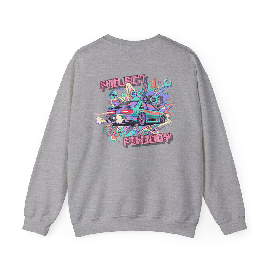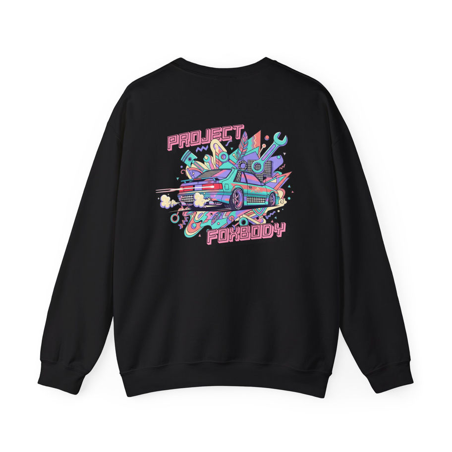 Crewneck Sweatshirt - 'Project Foxbody' Retro Neon Car Mechanics Graphic